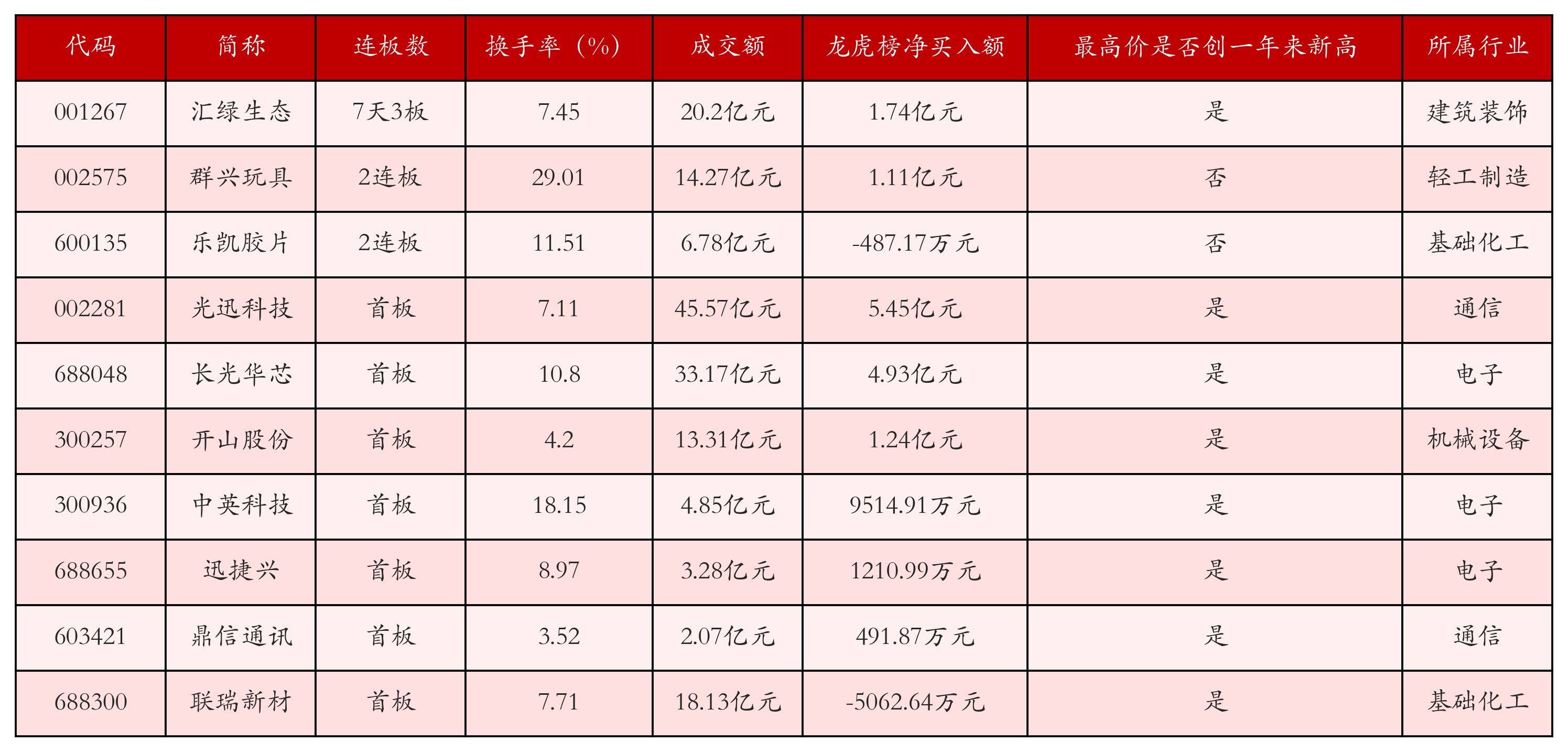 截至3月10日收盘,上证综指上涨0.65%,收于4123.14点,深证成指上涨2.04%,收于14354.07点,创业板指上涨3.04%,收于3306.14点。今日沪深两市A股共计71只涨停,综合当前连板数以及当日龙虎榜数据,其中较为强势的前三只个股分别为:汇绿生态(001267)、群兴玩具(002575)与乐凯胶片(600135)。今日强势个股前10位具体数据见下表: